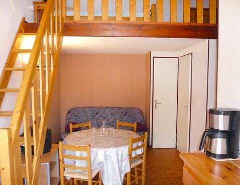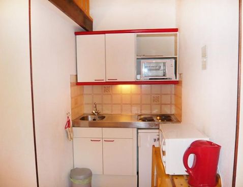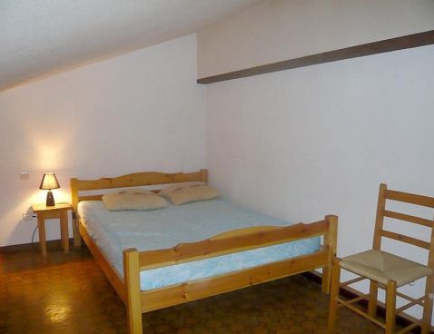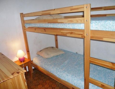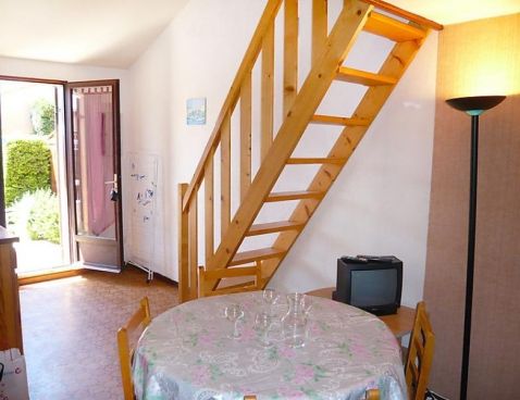 2-room house 24 m2 on 2 levels: living/dining room with TV and electric heater. 1 room with 1 x 2 bunk beds (90 cm). Kitchenette (3 hot plates, oven, microwave). Bath/WC. Upper floor: gallery, ceiling height 145 - 220 cm, without window with 1 double bed (140 cm). Terrace, west facing position. Terrace furniture.