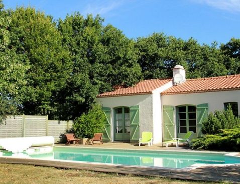 6-room house 150 m2. Spacious, comfortable furnishings: large living/dining room with panoramic window with TV (flat screen). Exit to the terrace. 1 room with 1 french bed (140 cm), bath/shower. Exit to the garden. 1 room with 1 double sofabed (140 cm). Exit to the garden. 1 room with 1 bed (90 cm), 1 french bed (140 cm). Exit to the garden. 1 room with 1 bed (90 cm), hand-basin. Exit to the garden. 1 room with 1 bed (90 cm). Exit to the garden. Large, open kitchen (oven, dishwasher, 4 induction hot plates, microwave, electric coffee machine). Shower/WC, sep. WC. Large terrace, south facing position and west facing position. Terrace furniture, barbecue. Beautiful view of the swimming pool and the garden. Facilities: washing machine, baby cot for up to 2 year olds. Please note: suitable for families. 1 pet/ dog allowed. TV only FR. Included: Cot (up to 2 years), Pet, Final cleaning Available on site with supplement: Towels (initial supply) 5.0EUR per person, Bed linen (initial supply) 15.0EUR per person Mandatory extra services on site: Local tax 0.87EUR per person/day \n\nChauvé 12 km from Pornic: Beautiful single-family house "L'Auvière", surrounded by trees. In a hamlet, outside the resort, 4.5 km from the centre of Chauvé, in a quiet position, 15 km from the sea. Private: park 2'500 m2, swimming pool angular, secured (5 x 10 m, depth 100 - 200 cm, 01.06.-30.09.) with shutter cover. Parking on the premises. Grocery 4 km, supermarket 9.5 km, restaurant 4 km, bakery 4 km, railway station "Pornic" 15 km, sandy beach "pornic" 15 km, thermal baths "pornic" 17 km. Nearby attractions: Saint Père en Retz 4 km, St Brévin 15 km. Please note: car recommended. The keys‘ handover takes place by the agency des Flots in Pornic, 12 km. Animals in the neighbourhood.