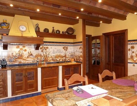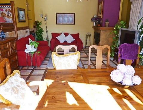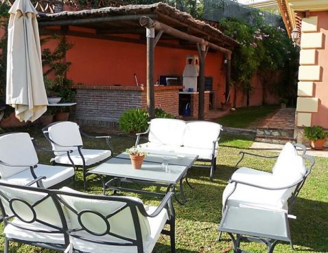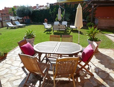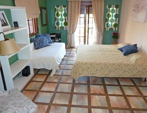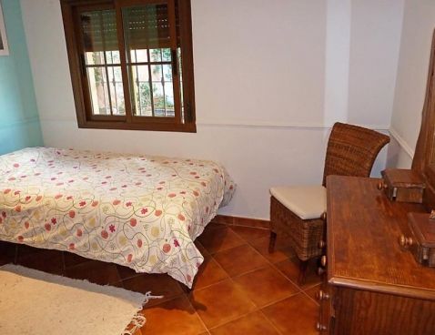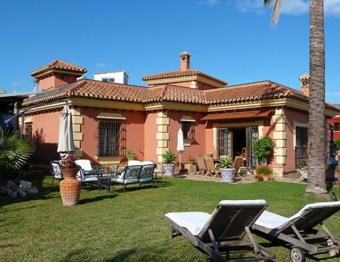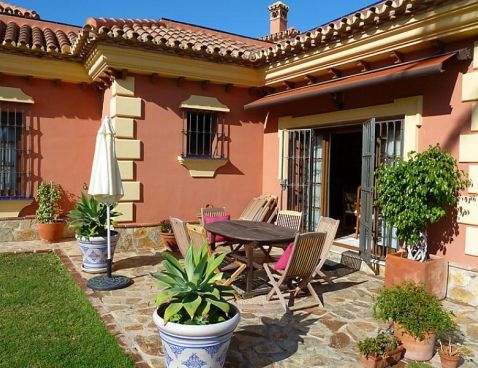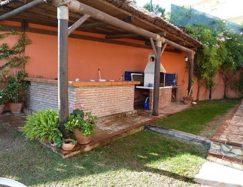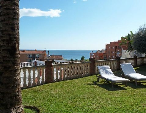 5-room villa 198 m2. Spacious and bright, beautiful and tasteful furnishings: living/dining room with open-hearth fireplace, satellite TV and wood-burning stove. Exit to the garden. 1 room with 1 french bed and shower/bidet/WC. 2 rooms, each room with 1 bed (105 cm). 1 room with 3 beds (90 cm), 1 folding bed (90 cm). With sloping ceilings, large kitchen-/living room (oven, dishwasher, 4 ceramic glass hob hotplates, microwave) with bar. Shower/WC, sep. WC. Garden, lawn 300 m2. Terrace furniture, barbecue, deck chairs. Panoramic view of the sea. Facilities: washing machine. Suitable for families. 1 small pet/ dog allowed. Included: Final cleaning, Laundry (initial supply of bed linen and towels) Available on site with supplement: Pet 1.0EUR per day \n\n Cosy, rustic, comfortable villa "Villa La Palmera". In the resort Fuengirola, in a quiet, sunny position, 700 m from the sea, 700 m from the beach. For shared use: garden lawn 1'000 m2, swimming pool angular (15 x 8 m, 01.01.-31.12.). Outdoor shower, garden furniture. Private: garden lawn 300 m2. Stepped path to the house. Supermarket, shopping centre, restaurant, bar 600 m. Sports harbour 3 km, golf course 2 km, tennis 3 km. Nearby attractions: Centro Comercial Myramar 600m, Zoo de Fuengirola, Puerto, Acuapark. Community swimming pool for 8 houses.