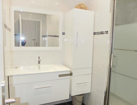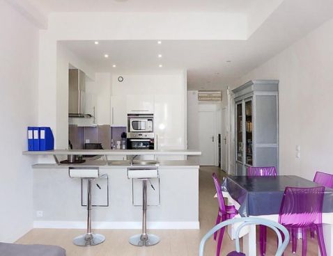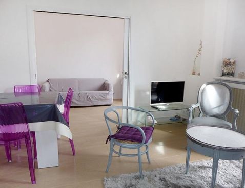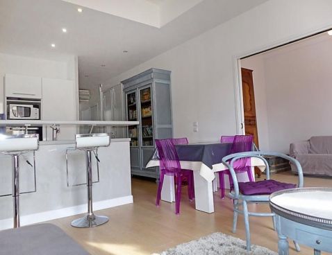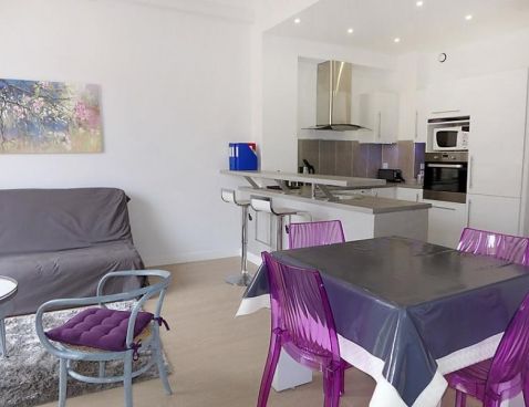 3-room apartment 65 m2 on 2nd floor. Fully renovated, tasteful furnishings: living/dining room with sliding door with 1 double sofabed (140 cm, length 190 cm), flat screen. 1 room with 1 double bed (140 cm, length 190 cm), shower and flat screen. 1 room with 1 double bed (140 cm, length 190 cm). Open kitchen (oven, dishwasher, 4 ceramic glass hob hotplates, microwave, electric coffee machine, steamer). Shower, sep. WC. Heating. Facilities: washing machine, iron, hair dryer. Included: Local tax children 3-12 years Available on site with supplement: Booster seat (for children), Buggy, Bed linen (initial supply), Cot (up to 2 years), Highchair, Towels (initial supply), WIFI (3G wireless modem for max. 5 connecting devices – LIMIT 1 GB per week) Mandatory extra services on site: Final cleaning 24.6 EUR per person, Local tax 0.9 EUR per person/day\n\nHistorical small apartment house "Rolland", 5 storeys. 1 km from the sea. In the complex: lift. Shop, bakery 50 m, tram 100 m, shingle beach 1 km. Marina 2 km, golf course (18 hole) 18 km. Nearby attractions: eglise jeanne d'arc, gare provencale.