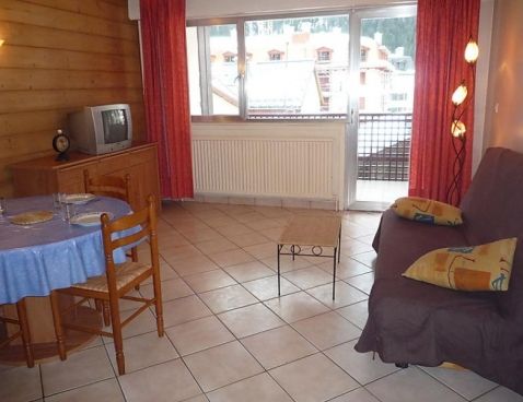1-room studio 32 m2 on 1st floor. Living/dining room with 1 double sofabed and TV. Exit to the balcony. Entrance hall with 2 wall-trunk beds. Kitchenette (4 hot plates, dishwasher, microwave). Shower/WC. Balcony, south facing position. View of the mountains. Please note: maximum 1 small pet/ dog allowed. TV only FR.