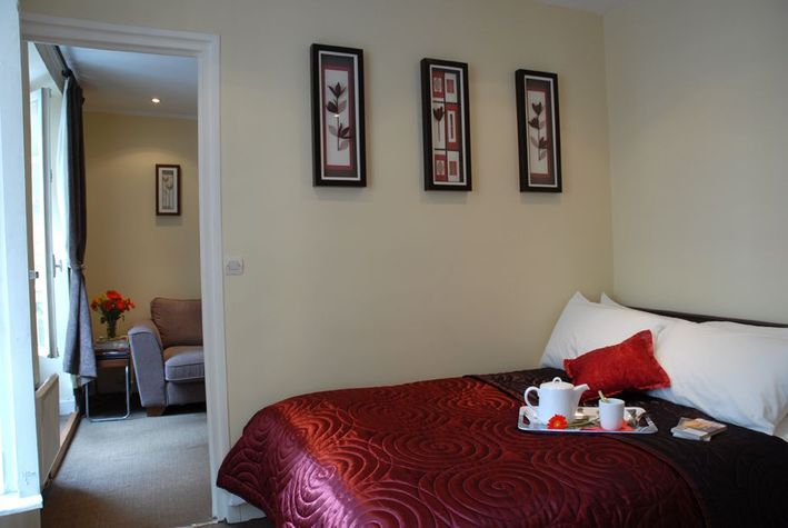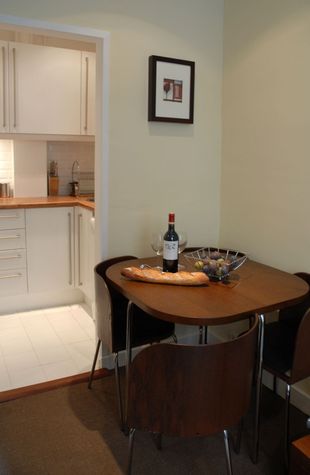 Beside the table is a flat screen LCD television with a built-in DVD player. There is also full cable service that includes a minimum of four English speaking channels to compliment the array of other channels offered. The apartment has wireless broadband Internet access that can be beneficial when doing a last minute check on flights, checking up on work or staying in touch with people at home. The room is complimented by a stylish sofa bed that matches the lined curtains. When closed, the curtains make this an extremely warm and cosy room to sit back and relax in.