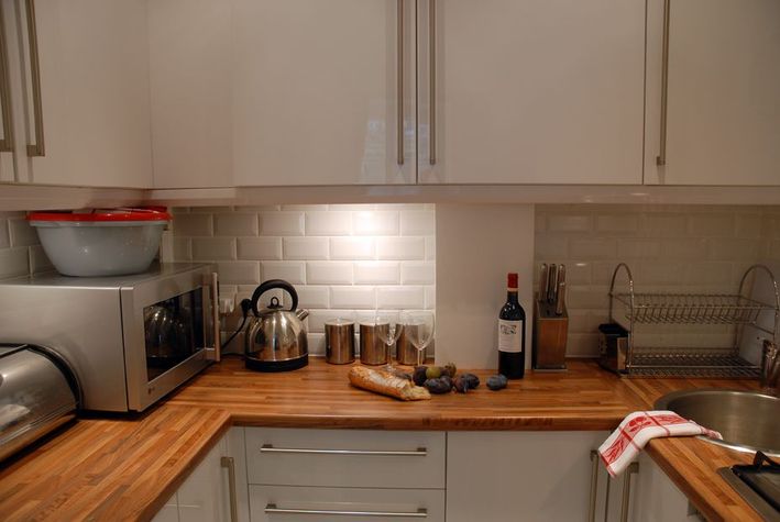 With its tall French windows that open up to provide a view of the street below, you feel as if you are getting to know the authentic Paris. This apartment has been completely refurbished so all of the furnishings and decor are modern and new. It is set to maximise the charm of what a Parisian apartment is like. The living and dining room area has a four-seater table that is perfect for enjoying your evening meal or a fresh croissant and café in the morning.