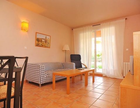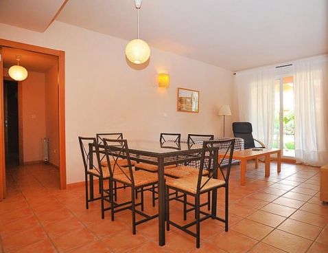 3-room apartment on the ground floor. Practical furnishings: living/dining room with TV. Exit to the patio. 1 room with 2 beds. Exit to the garden. 1 room with 2 beds and shower/bidet/WC. Kitchen (oven, microwave, freezer, electric coffee machine). Bath/WC. Terrace furniture. View of the swimming pool. Facilities: washing machine. Garage.