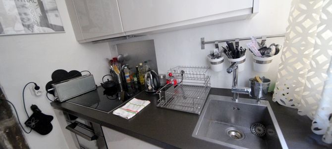 Kitchen Open and cozy with its bar and two stools. The kitchen is equipped with: 3 hotplates, oven (oven + microwave), Nespresso machine, fridge, kettle, toaster, steamer, juicer and all other necessary kitchen items.