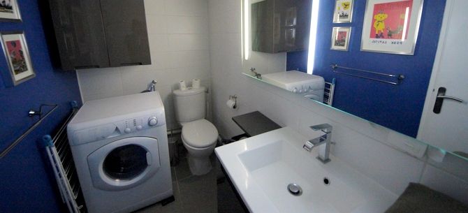 Bathroom Spacious and modern, the bathroom is equipped with a bathtub, sink, mirror, toilet and a washing machine.