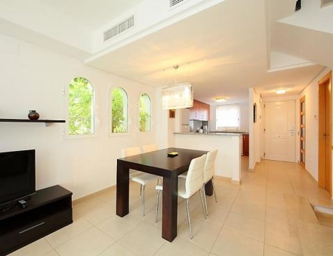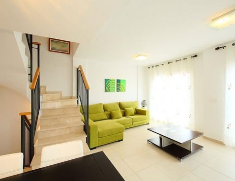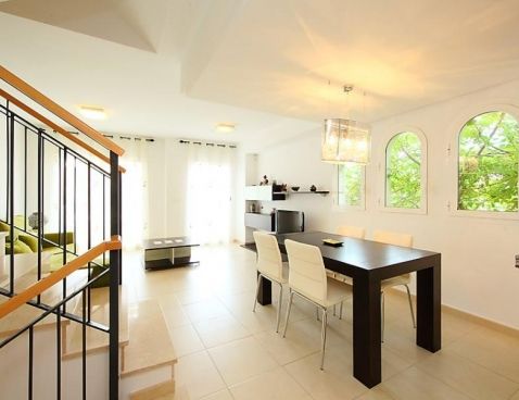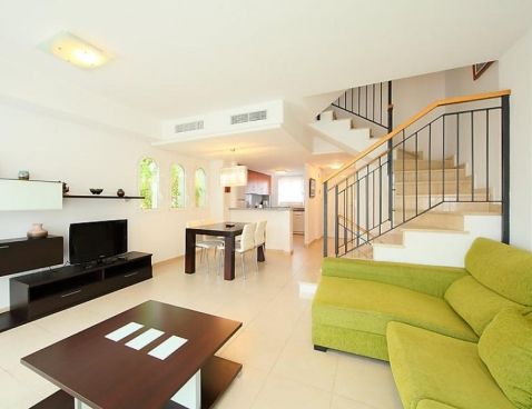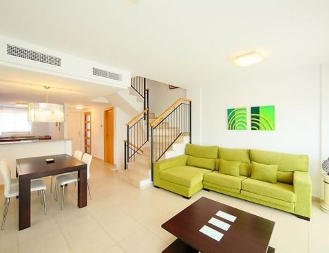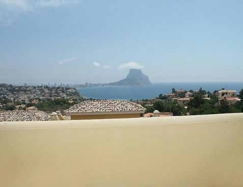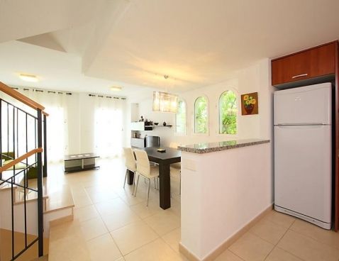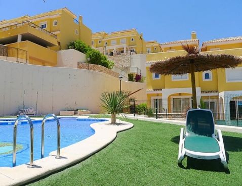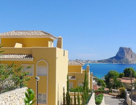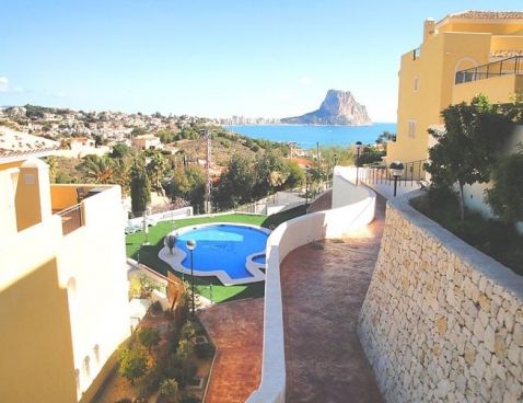 4-room terraced house 147 m2 on 2 levels. Modern furnishings: living/dining room 25 m2 with digital TV. Exit to the terrace. Open kitchen (oven, dishwasher, microwave, freezer). Sep. WC. Air-conditioning, forced-air heating. Upper floor: 1 room with 1 double bed and bath/bidet/WC. 1 room with 1 sofabed. 1 room with 2 beds. Shower/WC. Air-conditioning, forced-air heating. Terrace, garden 45 m2. Terrace furniture, deck chairs (2), box-room. Marvellous view of the sea and the mountains. Facilities: washing machine. Reserved parking space n 22 (roofed) at the house. Maximum 1 pet/ dog allowed. AT-435208-A Included: Pet Available on site with supplement: Buggy, Cot, Highchair, Internet mobile 3G USB, Extra bed Mandatory extra services on site: Final cleaning 23.0 EUR per person, Laundry (initial supply of bed linen and towels) 13.0 EUR per person\n\nMaryvilla: Cosy residence "Montesol 1". 2.2 km from the centre of Calpe, in an elevated position, 900 m from the sea. For shared use: swimming pool (01.01.-31.12.) with internal staircase. Children's pool, terrace. Pre-arrival grocery service. Supermarket 1.2 km, restaurant, bar 200 m, diving center 800 m, swimming bay 900 m. Sports harbour 800 m, tennis 200 m. Nearby attractions: Aqualandia, Mundomar, Terra Mítica, Terra Natura, Y Benidorm Palace (Benidorm). On request: airport transfer to the holiday accommodation.