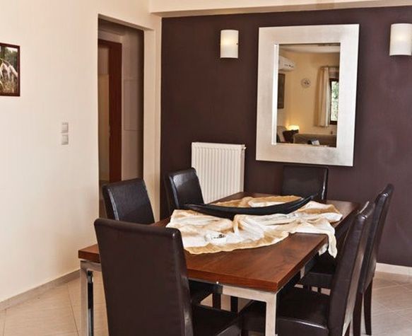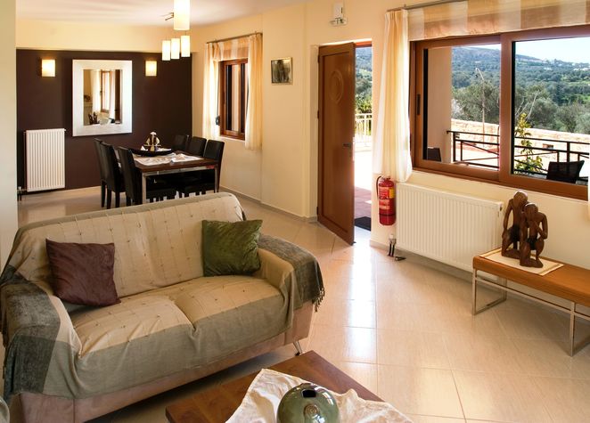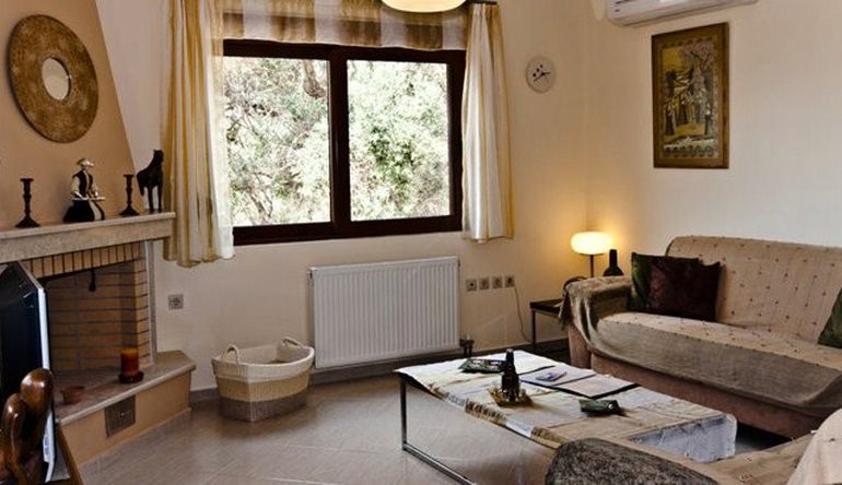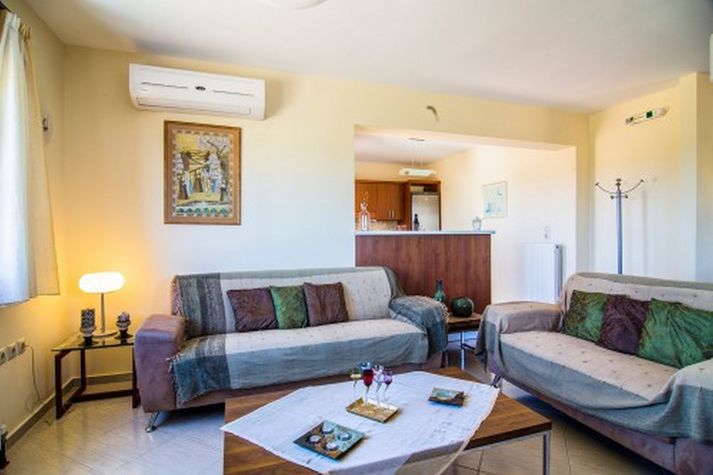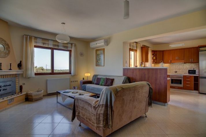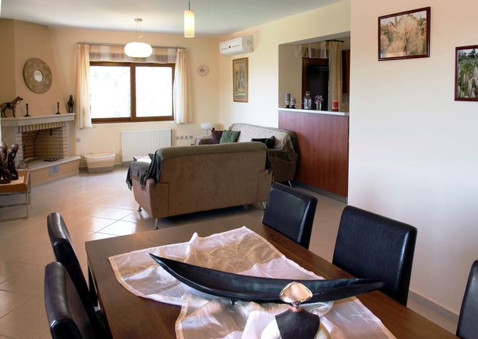 A spacious open plan living area. The dining room has a dining table and chairs. The sitting room with a triple and double sofa. LCD TV in sitting area offering Greek channels and hot bird satellite connection for foreign channels. Air-conditioning unit (cool/heat). Open fire place in the sitting area.