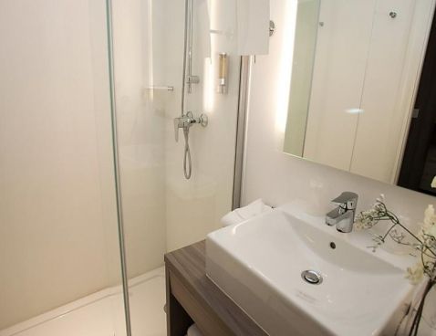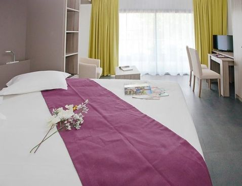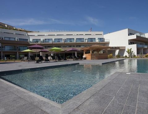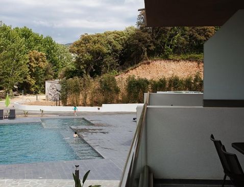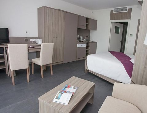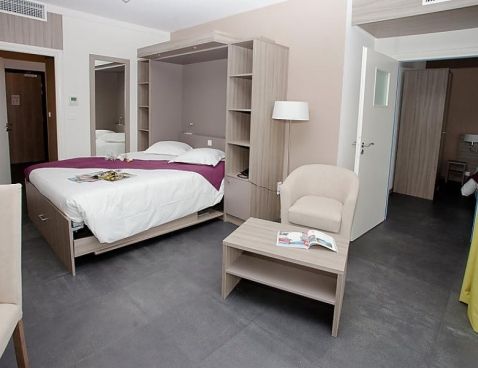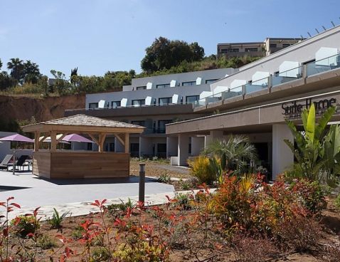 1-room studio 32 m2, modern and cosy furnishings: sleeping alcove with 1 x 2 bunk beds (90 cm, length 200 cm). Living/sleeping room with 1 double wall-trunk bed (160 cm, length 200 cm), TV (flat screen), DVD. Exit to the terrace. Kitchenette (2 hot plates, dishwasher, microwave, freezer). Shower, sep. WC. Air-conditioning. Terrace 10 m2. Terrace furniture. Partial view of the swimming pool and the garden. Facilities: Internet (WiFi, free). Please note: non-smokers only. Included: Final cleaning, Wireless internet access (WIFI), Laundry (initial supply of bed linen and towels) Available on site with supplement: Pet 10.0EUR per day Mandatory extra services on site: Local tax 1.5EUR per person/day \n\nResidence "Suite-Home Porticcio", 3 storeys, built in 2014. 60 apartments in the residence. On the outskirts, on a slope, 100 m from the beach, road to cross, on a main road. For shared use: property 1 ha (fenced), swimming pool (21 x 7 m, 15.05.-01.10.) with internal staircase. Shower/WC in the pool area. In the complex: reception, breakfast room, WiFi, sauna, fitness room, lift, air conditioning, washing machine, tumble dryer (for shared use). Breakfast on request (extra). Motor access to the house. Roofed, parking (extra). Shop, grocery, supermarket, restaurant, sandy beach 100 m. Nearby attractions: Ajaccio 15 km, Propriano 50 km, Sartène 60 km, Bonifacio 100 km. Please note: baby equipment on request (included). Loading and unloading of baggage is possible at the holiday house. Guarded residence. The photograph shows a typical example. There are more similar properties for rent in this same residence.