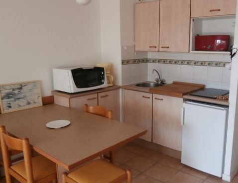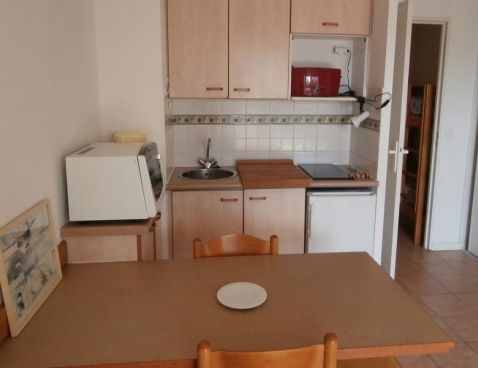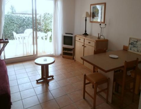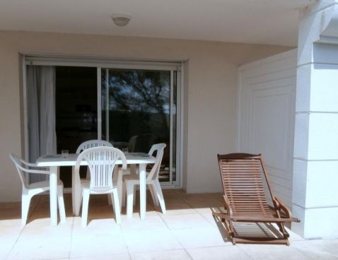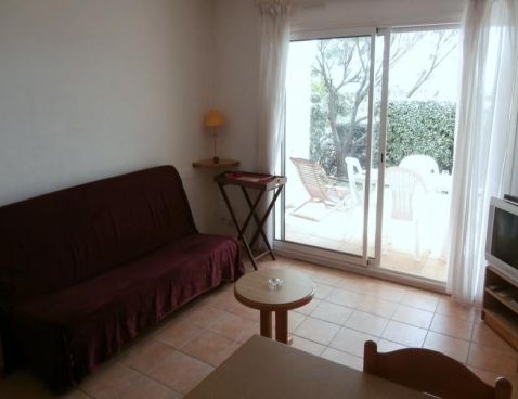 Modern studio located on ground floor with comfortably furnished. Living room giving onto terrace with double sofa bed. Basic open kitchen with 2 hotplates. 1 alcove bedroom with bunk beds.\n\nSmall building in private complex in residential area. Located near the sea. Car recommended. Public parking. Shared pool open to the May 15, September 30, weather permitting and excluding annual maintenance closings.