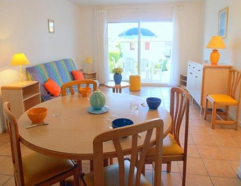 Modern apartment with shared pool and comfortably furnished. Living room sitting with trundle beds are giving onto terrace. Functional open-plan kitchen with 2 hotplates. 1 bedroom with double bed (140 cm). 1 bedroom with twin beds (90 cm).\n\nSmall building in private complex in residential area. Located near the sea. Car recommended. Public parking. Shared pool open to the May 15, September 30, weather permitting and excluding annual maintenance closings.