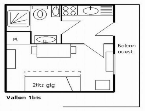 LE VALLON N° 1BIS - TYPE A - 18 m2 Classification 2* Located next to the slopes, studio 2 people, higher ground floor, west balcony, ski locker, entrance by west balcony. - 1 living-room: 2 adjustable pull-out beds (2x1pers) - 1 kitchen: 2 electric hot plates, refrigerator, oven. - 1 shower-room with wc. washing-machine Television Animals are not allowed \n\nSituation : situated in the centre area, on the slopes - 100m from the ski-bus stop - 100m from the shops