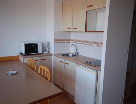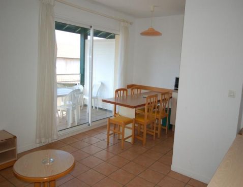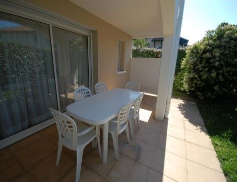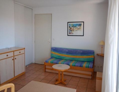 Modern apartment located on ground floor with comfortable furnishings. Living room sitting are giving onto terrace. Functional open-plan kitchen with 2 hotplates. 1 bedroom with double bed 140 cm. 1 alcove bedroom with bunk beds 80 cm.\n\nSmall building in residential area. Located near the sea. Car recommended. Public parking. Shared pool open to the May 15, September 30, weather permitting and excluding annual maintenance closings.