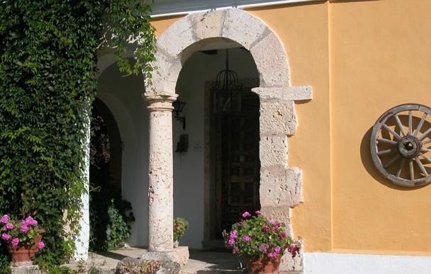 Once inside the grounds, you will follow the road surrounded by Hazelnut trees until you arrive at the main door of the house. There, you will see a column with two Roman arches (from the 12th century) and a small porch with a large wooden door.