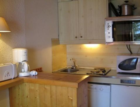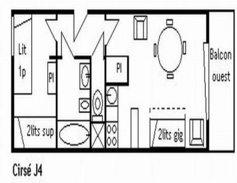 LE CIRSE N° J 4 - TYPE D - 28 m2 Classification 2* Apartment 4 people, 1st floor, lift, west balcony, ski locker. - 1 living-room: 2 adjustable pull-out bed (2x1p) - 1 kitchenette: 2 vitro-ceramic hot plates, oven, microwave, refrigerator, dishwasher - 1 bedroom: 2 bunk beds, 1 single bed (3x1p) - 1 bathroom - 1 wc - Télévision \n\nSituation : situated in the Plateau area - 100m from the slopes - 150m from the ski-bus stop - 150m from the shops - 3km from the centre Residence : with lift