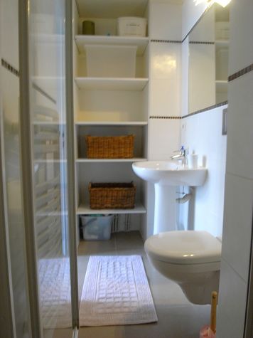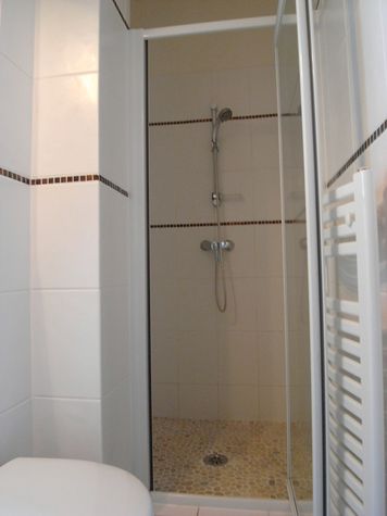 Bathroom The bathroom (about 2 sqm) has a big shower decorated with a stone floor. The remaining part of the floor is tiled.