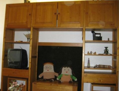 Living room with a drop-down double bed and a trunkle bed, TV.