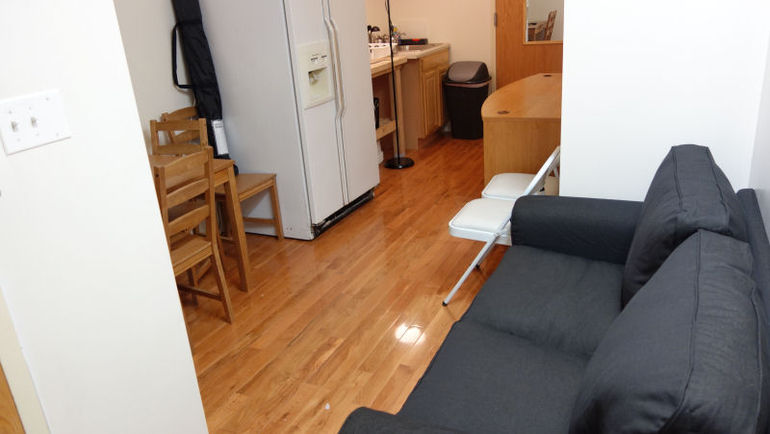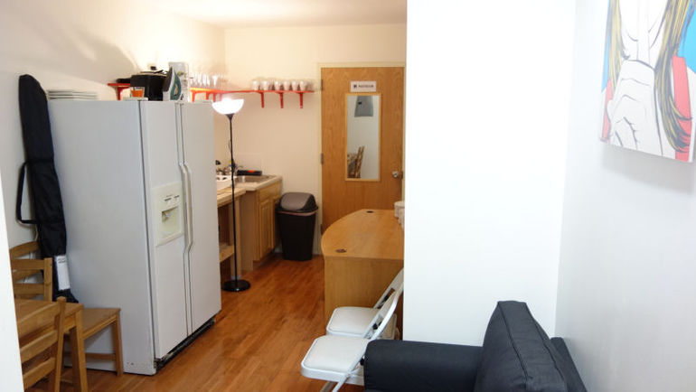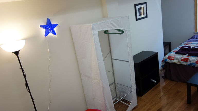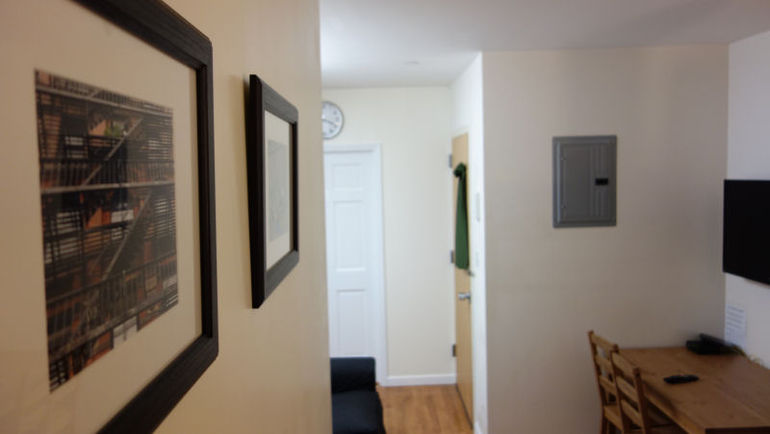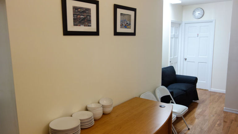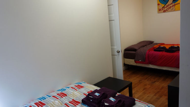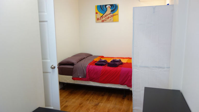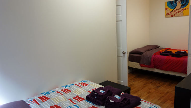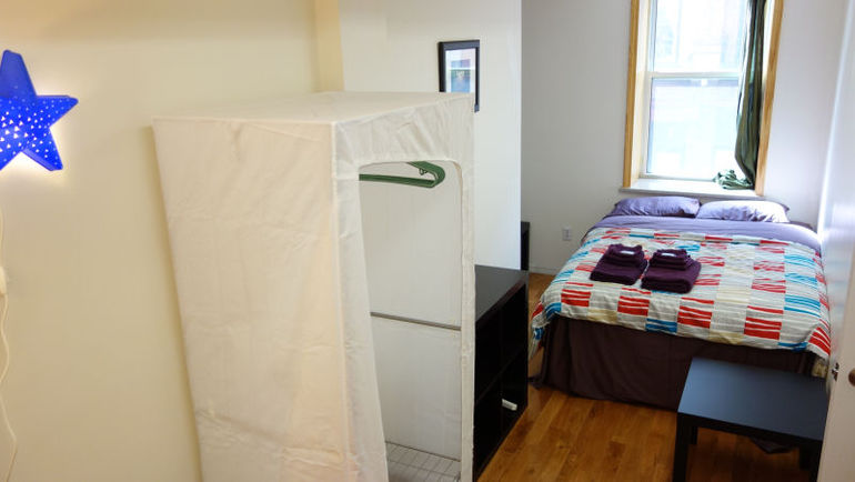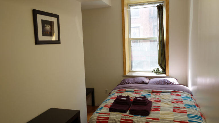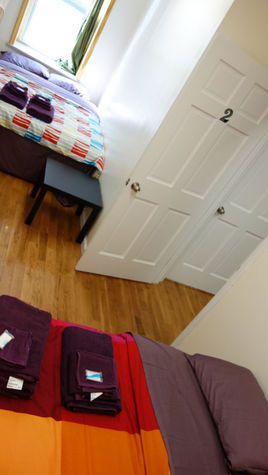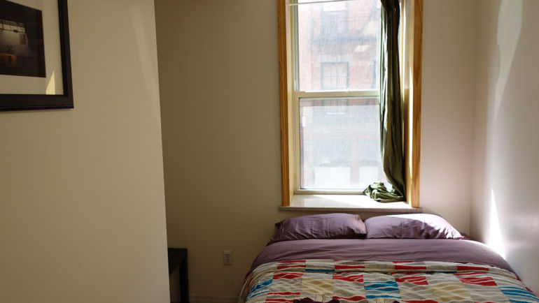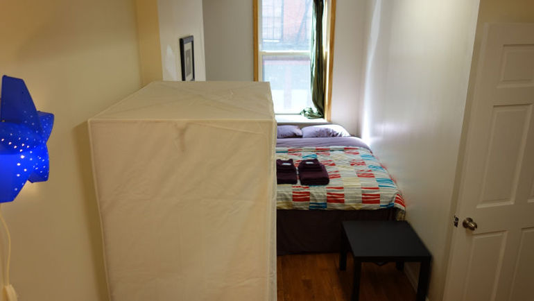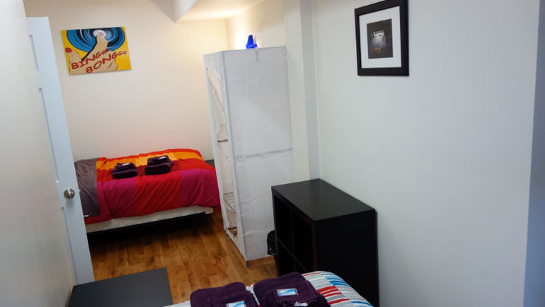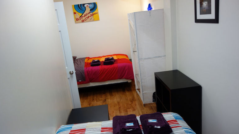 This private bedroom with 2 double beds in a wonderful 4 bedroom loft apartment situated within a historic New York City building which has retained its exposed piping, a fire-escape outside the window and vintage radiators.