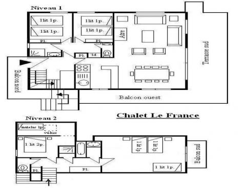 CHALET LE FRANCE - 120 m2 Classification 3* Label Meribel - Chalet 8/10 people, south terrace, west balcony, outside ski locker. - 1 living-room: fireplace - 1 kitchen: 4 ceramic hobs, oven, refrigerator, dishwasher, micro-waves - 2 bedrooms: 2 single beds (4x1p) - 1 shower-room - 1 wc 2° level: - 1 bedroom: 3 single beds, south balcony - 1 bedroom with a low sloping ceiling : 1 double bed - 1 alcove with a low sloping ceiling : 1 mattress - 1 bathroom - 1 shower - 1 wc - Television + DVD player - Internet connection - Wi-Fi (in case of a connection failure, the agency is not responsable) - Including the household linen- beds made on arrival Animals are not allowed \n\nSituation : situated at the altitude 1600 - +400m from the slopes - next to the ski-bus stop - 300m from the shops - 2km from the centre