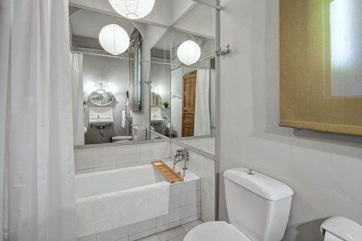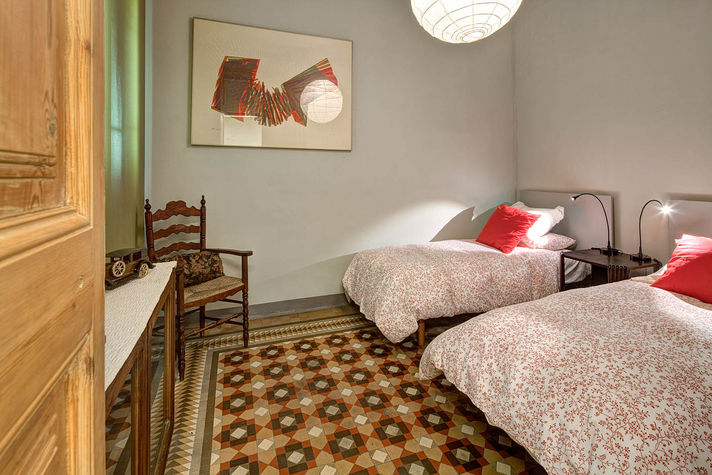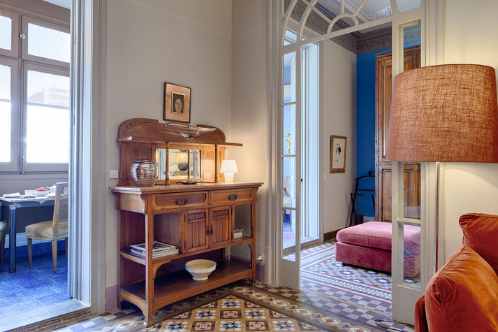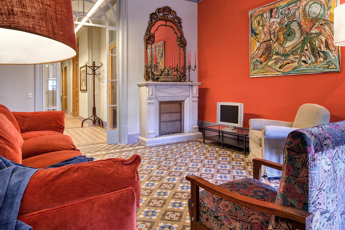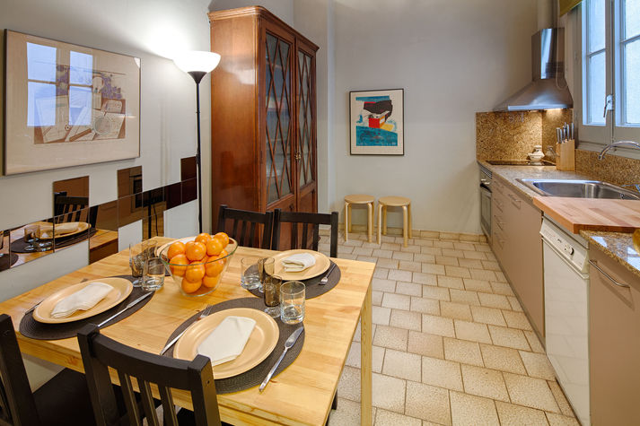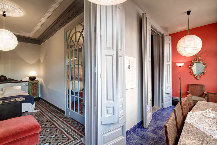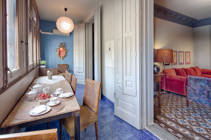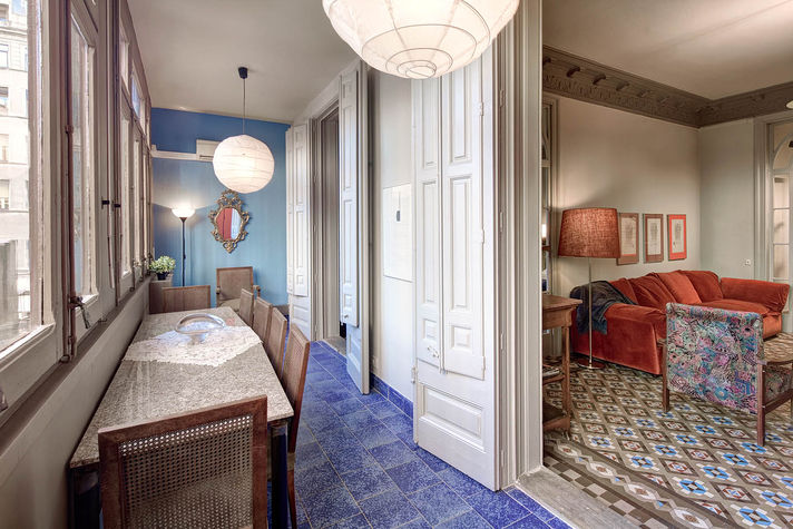 Balmes apartment in the central Eixample area, decorated with taste and elegance, is especially designed to make your holiday unforgettable. It features three bedrooms: The first is a double bedroom with a comfortable double bed and a wardrobe. The second and third are twin rooms with two single beds in each that can be joined upon request. It has two bathrooms, one with a sink and toilet and the other with shower and tub. In the main area you will find a large dining room, decorated with details and colours that become your favourite place of the apartment. Ceilings of 3.5 metres high with cornices. This room is equipped with a sofa for 4, plasma TV and two comfortable chairs. The dining room can seat up to 6 and is located near a window; this gives a beautiful view of the Coliseum Theatre and a very warm and bright atmosphere.