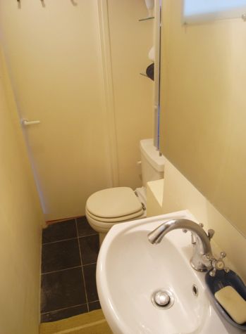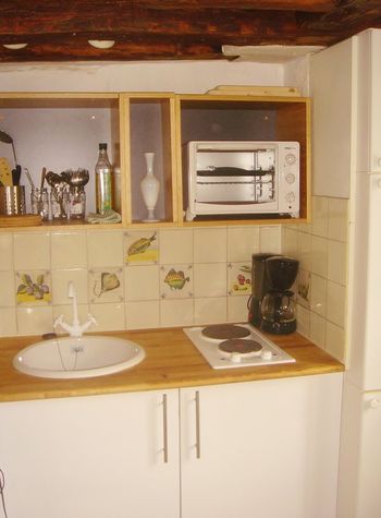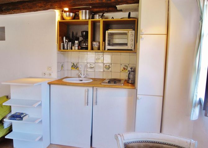 Also provided : bed linens, blankets, pillows and towels. Main room The main room (about 14 sqm) is furnished with a folding table suitable for 4 persons, a double sofa bed and a built-in closet. It is equipped with a stereo and a TV and it has tiled floor. Two double glassed windows face a quite street. Kitchen The small (about 2 sqm) but well equipped kitchen has also a double glassed windows on a side facing the wonderful Sainte-Catherine pedestrian square. Lots of utensils are provided such as oven, fridge, cooking plates, coffee maker, kettle… There are also some built-in wall closet and shelves. The floor is tiled.