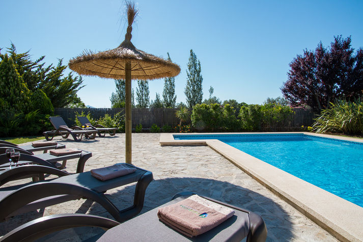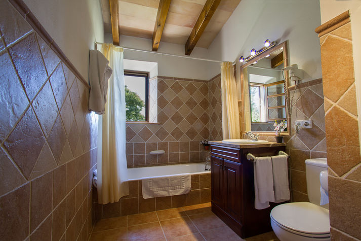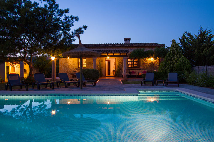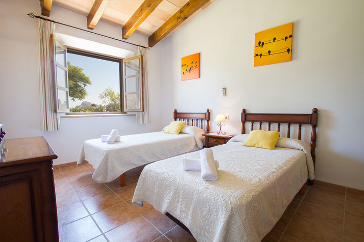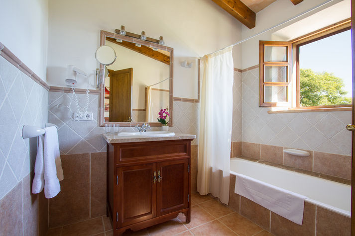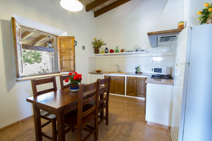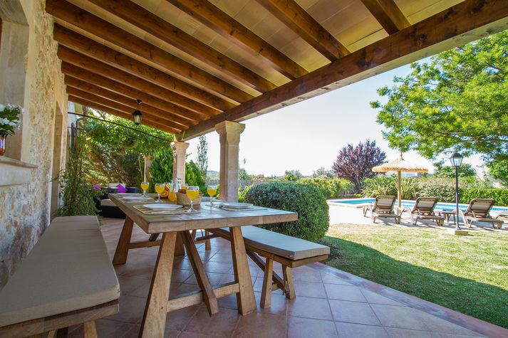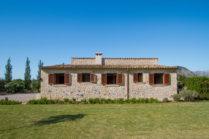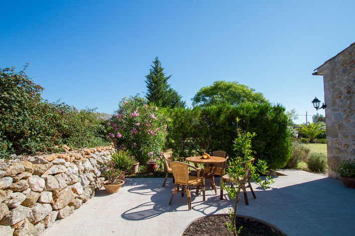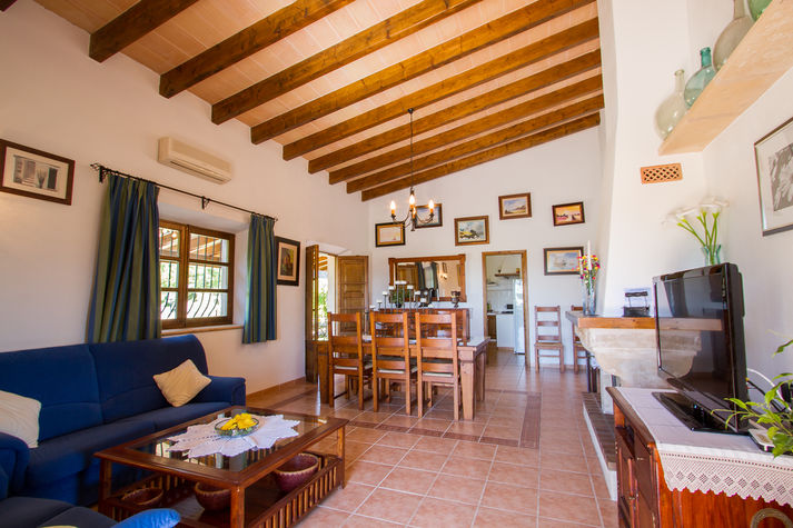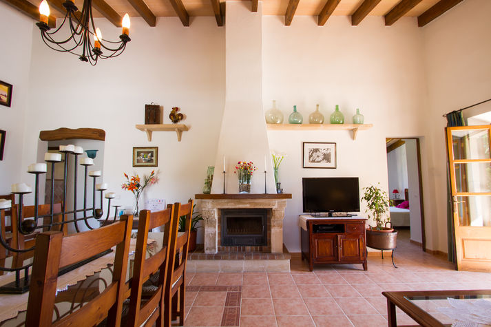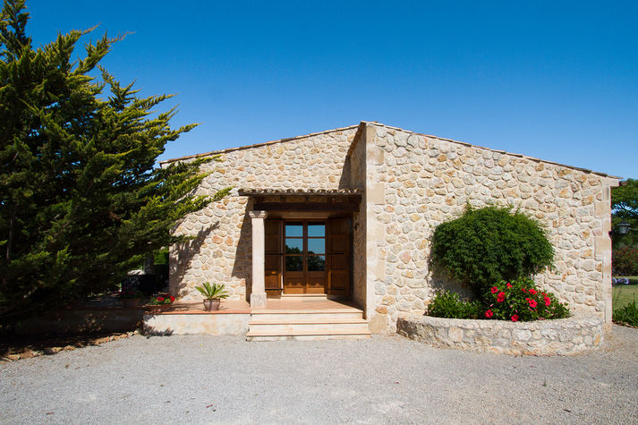 Set in pretty mallorcan countryside, this stone-clad bungalow property offers peace, privacy and a very high standard of accommodation. A short driveway leads to the house with side entrance under a covered terrace into a spacious and comfortably furnished lounge/dining room. This lovely room has a fireplace, beamed vaulted ceilings, satellite TV, DVD player and patio doors onto the front pool terrace. The fitted kitchen has dishwasher, microwave, breakfast area and pantry. Separate laundry with washing machine. From one end of the dining room is the air conditioned pretty master double bedroom with attractive en suite bathroom.