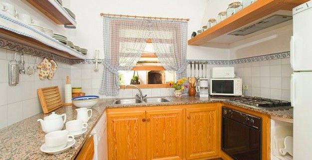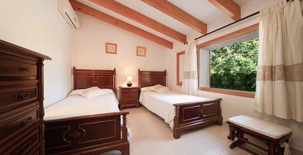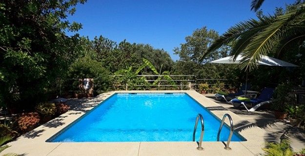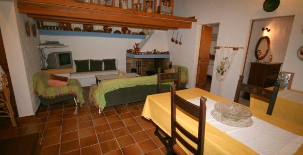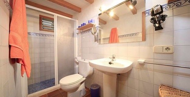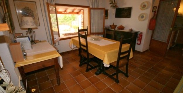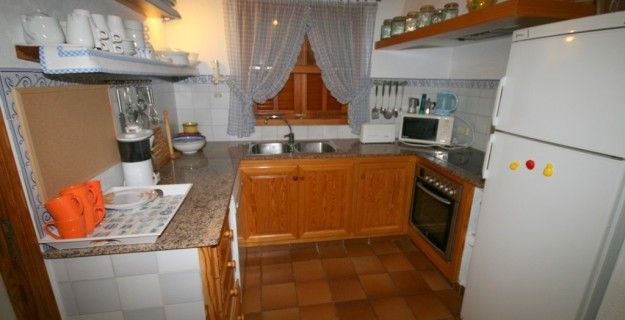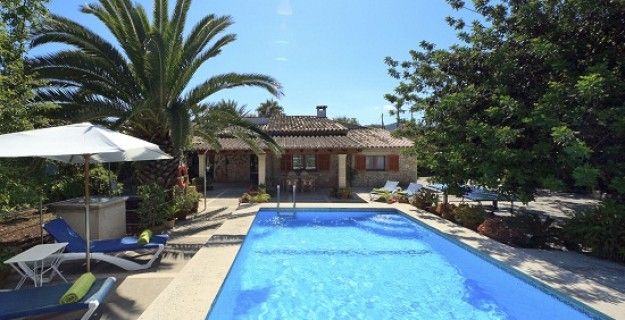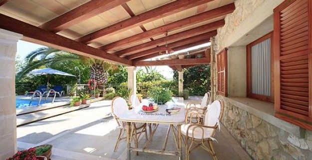 A delightful single storey stone villa set in the countryside close to the town of Pollensa. Large iron gates lead into a courtyard which takes you to the covered terrace and pool area. The entrance door opens into a lounge/dining room with high beamed ceilings and many mallorcan features. The lounge looks out over the pool area. Next to the lounge is a small open plan kitchen, a bedroom that has a low sloping ceiling and a double bedroom with a very high ceiling. The shower room is located off the kitchen. Under the covered terrace there is a built in barbecue and Mallorcan oven. There are table and chairs ideal for outside dining. Outdoor table tennis table. Lemon and orange groves and a very small banana plantation can be found in the garden. Pretty potted flowering plants give colour to the swimming pool area. The pool has stainless steel vertical rails both sides and Roman steps and a ladder step to get into the pool.