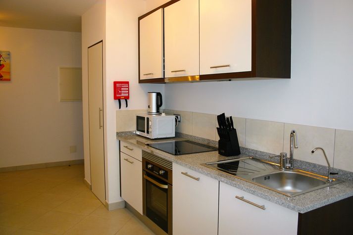 Apartment is self catering with a fully fitted equipped kitchen including all cooking and dining appliances such as a microwave, oven with electric hob, fridge/freezer, toaster, kettle and all crockery.