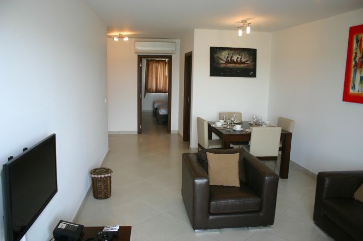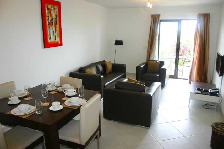 Lounge / dining area has a dining table, a comfortable sofa and 2 armchairs as well as a flatscreen TV and a telephone to contact reception.